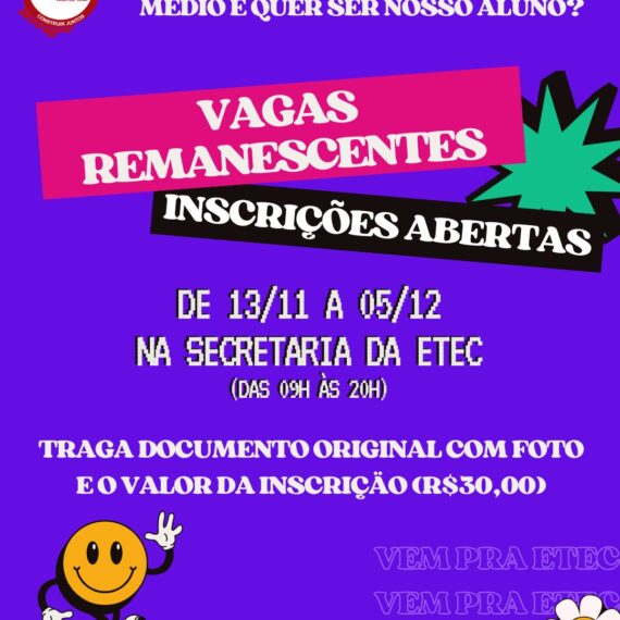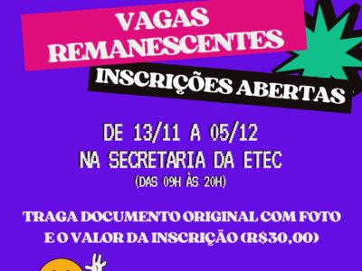 As inscrições deverão ser realizadas somente pela internet Acessar o site www.cps.sp.gov.br No site clique em Etec (barra vermelha); Em seguida em concursos; Do lado esquerdo clicar em ETEC, depois em “PROCESSO SELETIVO DE DOCENTES SIMPLIFICADO” e em “INSCRIÇÕES ABERTAS”; No campo FILTRO, digitar […]